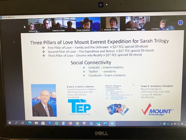 Having overcome some early ‘Zoom technical issues, we were then treated to a terrific presentation with Erwin Sniedzins chronicling his Everest adventures. Beginning with why he organized it (to raise money to find a cure for his daughter Sarah’s Rett’s disease) how he raised money and planned for it, then detailing how the climb unfolded.